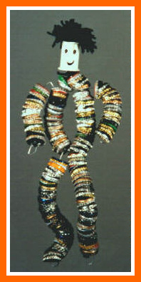 Hi my name is Mongabi, I'm a Bottle Cap man from South Africa. Some kids don't get to have soft drinks very often, so they save the caps as a special memory of the treat. Thank goodness, otherwise I wouldn't be born! You see, my body isn't made of bones, it is made of bottle caps. I'm a midget compared to my brother – he's a seven foot giant. If you want to make a Bottle Cap Man that big, you need to have lots of friends who can help you collect lots of bottle caps! Click here to find out how to make your own bottle cap man
